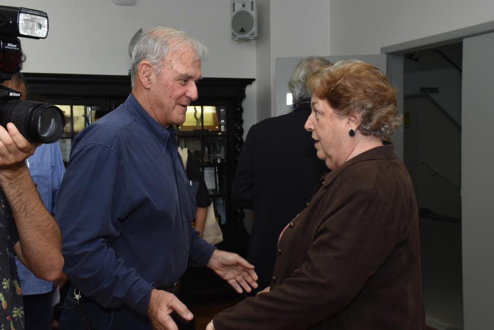 Profa. Margarida conversa com um convidado após o lançamento do livro.