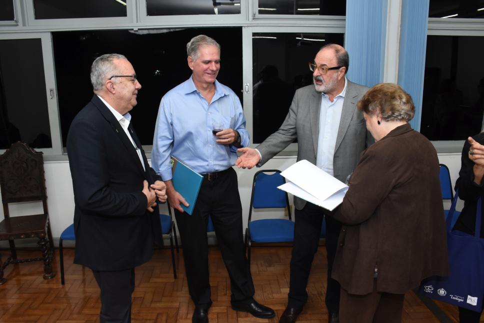 Da esq. para dir.: prof. pe. Josafá Carlos de Siqueira S.J (BIO, Reitor), prof. Walmir Ferreira Coutinho (CCBS), prof. Hilton Augusto Koch (EMPG, CCBS) e a profa. Margarida de Souza Neves (Núcleo de Memória).