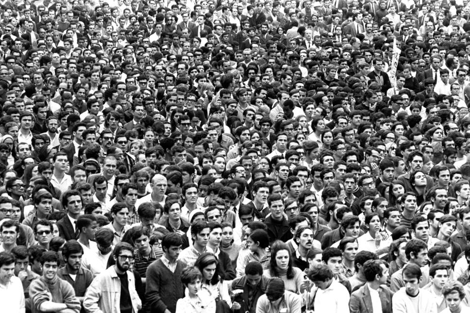 A multidão de rostos na Passeata dos Cem Mil, na Cinelândia, em 26/06/1968. Na parte inferior, quase ao centro, Ana Waleska, à época aluna de Pedagogia, aparece ao lado de Maria Cecília Londres, aluna de Letras. Fotógrafo José Inácio Parente.
