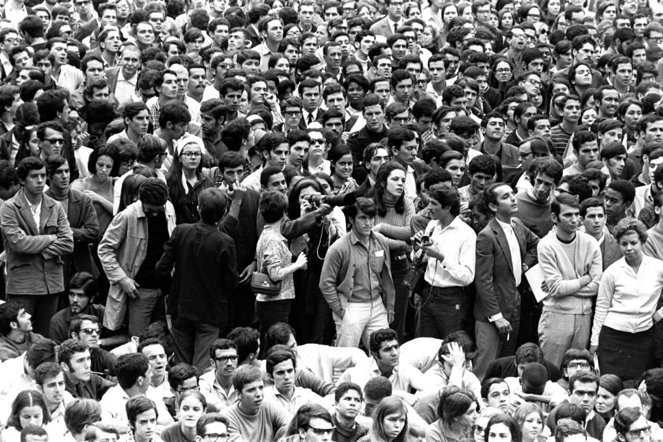 Na Passeata dos Cem Mil, em 26/06/1968, Ana Waleska, à época aluna de Pedagogia, aparece na primeira fila dos que estão em pé quase ao centro, ao lado da moça com a teleobjetiva e de Maria Cecília Londres, aluna de Letras. Fotógrafo José Inácio Parente.