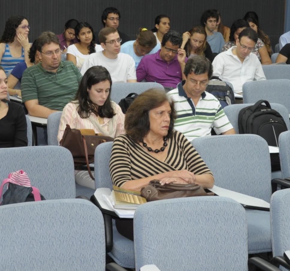 A Profa. Ana Waleska na plateia da Aula Inaugural do Departamento de Educação, em 17/10/2012, no Auditório Padre Anchieta. Um pouco atrás, à direita, o Prof. Marcelo Andrade (EDU). Fotógrafo Antônio Albuquerque.