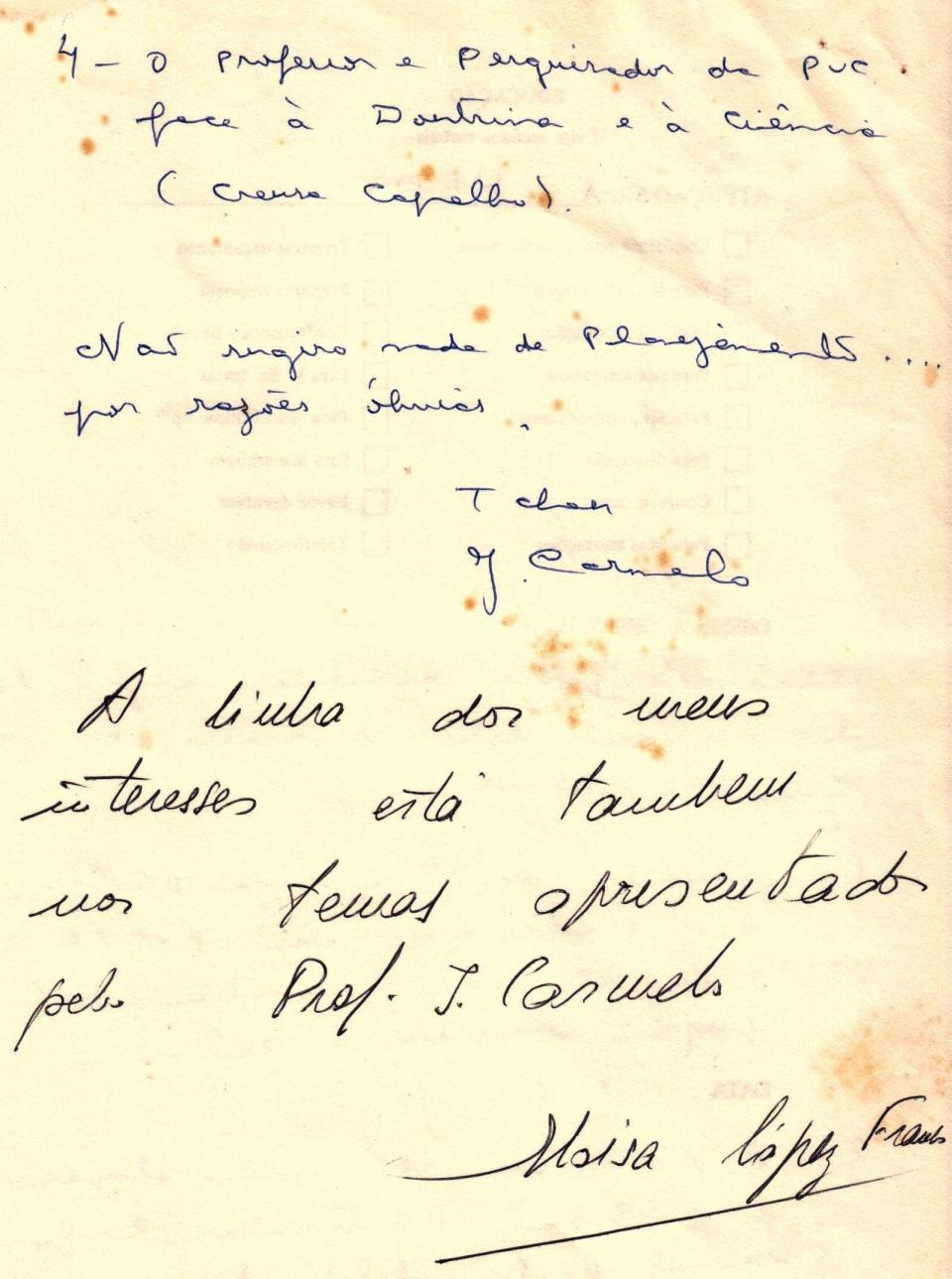 Levantamento sobre os interesses intelectuais dos professores da PUC-Rio; detalhe da ficha preenchida pelo Prof. José Carmello endereçado à Profa. Hedy (verso).
