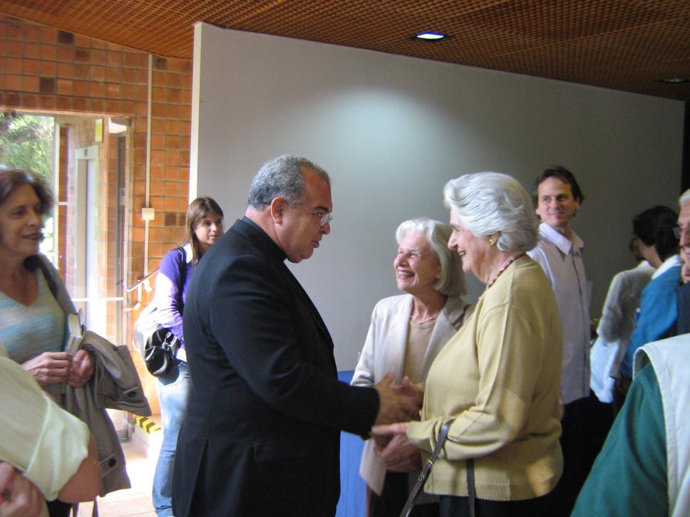 Recepção antes do lançamento do site. Dom Orani cumprimenta as senhoras Maria Helena Loureiro e Marina Araújo.
