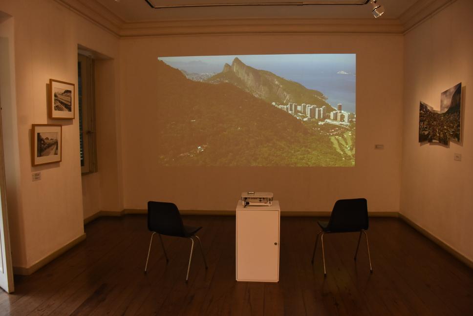 Instalações da exposição Gávea - Território de Diversidades, Morada de Contradições, no Solar Grandjean de Montigny entre 25 de julho e 26 de outubro de 2018. Sala do segundo andar com projeção de documentário sobre a Rocinha.
