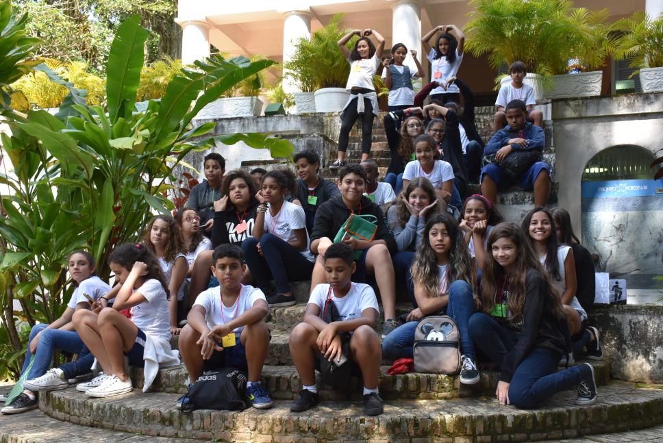 Alunos da Escola Jockey Club Brasileiro, localizada na Gávea, na escadaria do Solar antes da visita à Exposição. 13/09/2018.