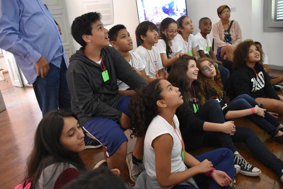 Visita de alunos da Escola Jockey Club Brasileiro, localizada na Gávea. Projeção de imagens da Rocinha na sala redonda do segundo andar. 13/09/2018.