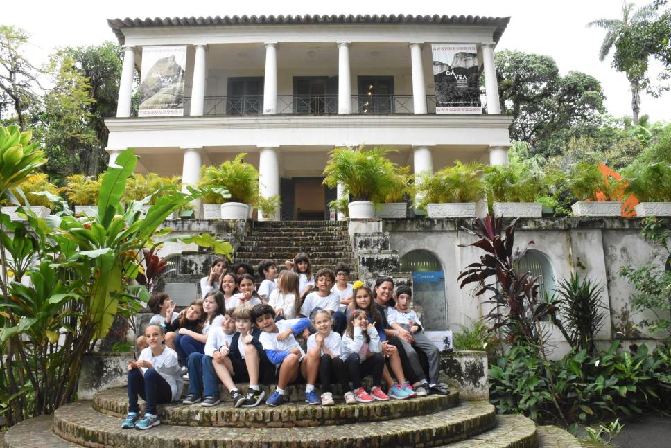 Visita de alunos do Colégio Teresiano à exposição. O grupo posa para fotos na escadaria do Solar.