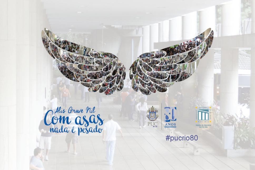 Painel instalado nos pilotis do Edifício Cardeal Leme, no Bloco B, com asas referentes ao lema da Universidade, "Com asas nada é pesado", composta por fragmentos de imagens de pessoas nos pilotis.
