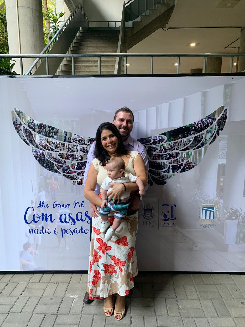O irmão Rodrigo Bastos, a cunhada Aline de Souza Bastos e o sobrinho Pedro de Souza Bastos após acompanharem a defesa da tese de doutorado do professor Felipe Bastos no Programa de Pós-graduação em Educação.