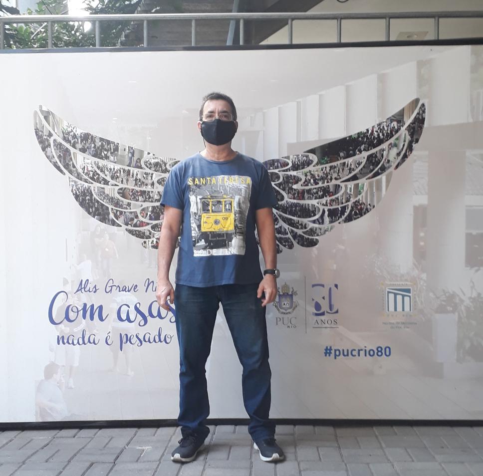 O funcionário Carlos Alberto Silva Pereira, da Divisão de Bibliotecas e Documentação, posa em frente às asas colocadas nos pilotis do Edifício Cardeal leme.