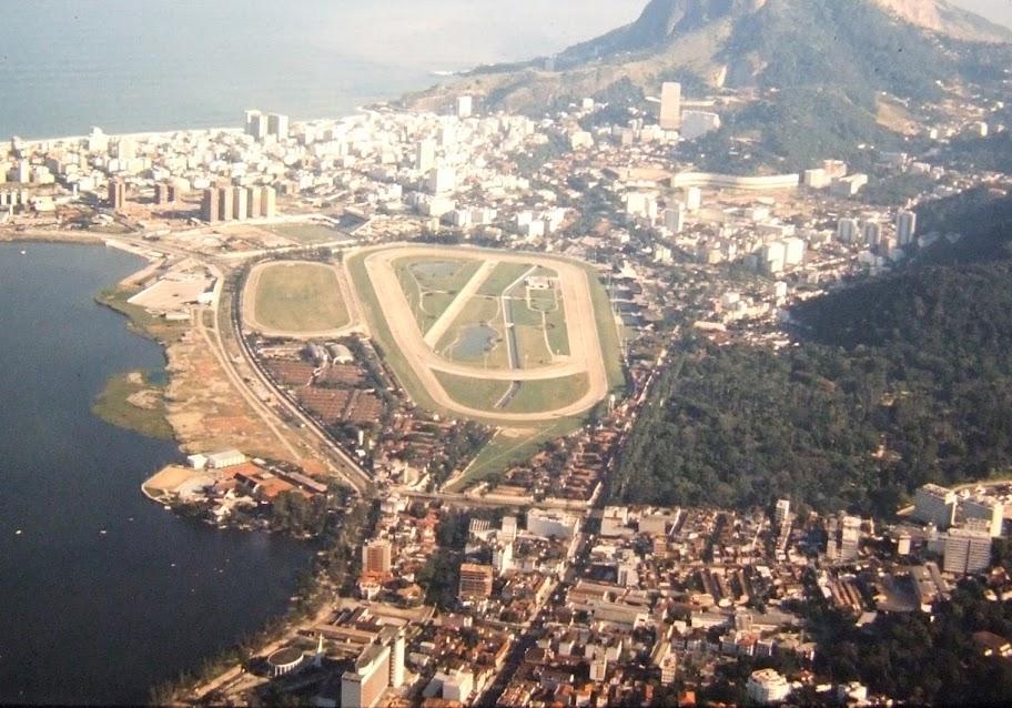 Imagem feita a partir do Corcovado, que mostra a Lagoa Rodrigo de Freitas, o Jockey Club, o Jardim Botânico, o bairro do Leblon e o bairro da Gávea. É possível ver o Conjunto Habitacional Marques de São Vicente e a PUC-Rio, e o espaço ocupado pelo Parque Proletário da Gávea.