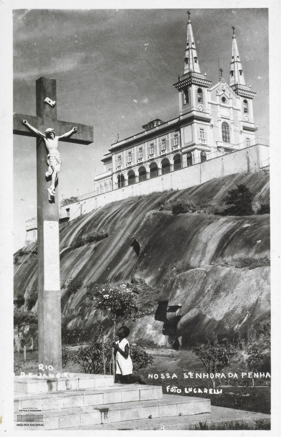 Igreja de Nossa Senhora da Penha, Rio de Janeiro. No postal, em destaque, o Cruzeiro da Universidade, erguido em homenagem à criação da Universidade Católica, na época ainda FaculdadesCatólicas. Arquivo Nacional, fundo Correio da Manhã.