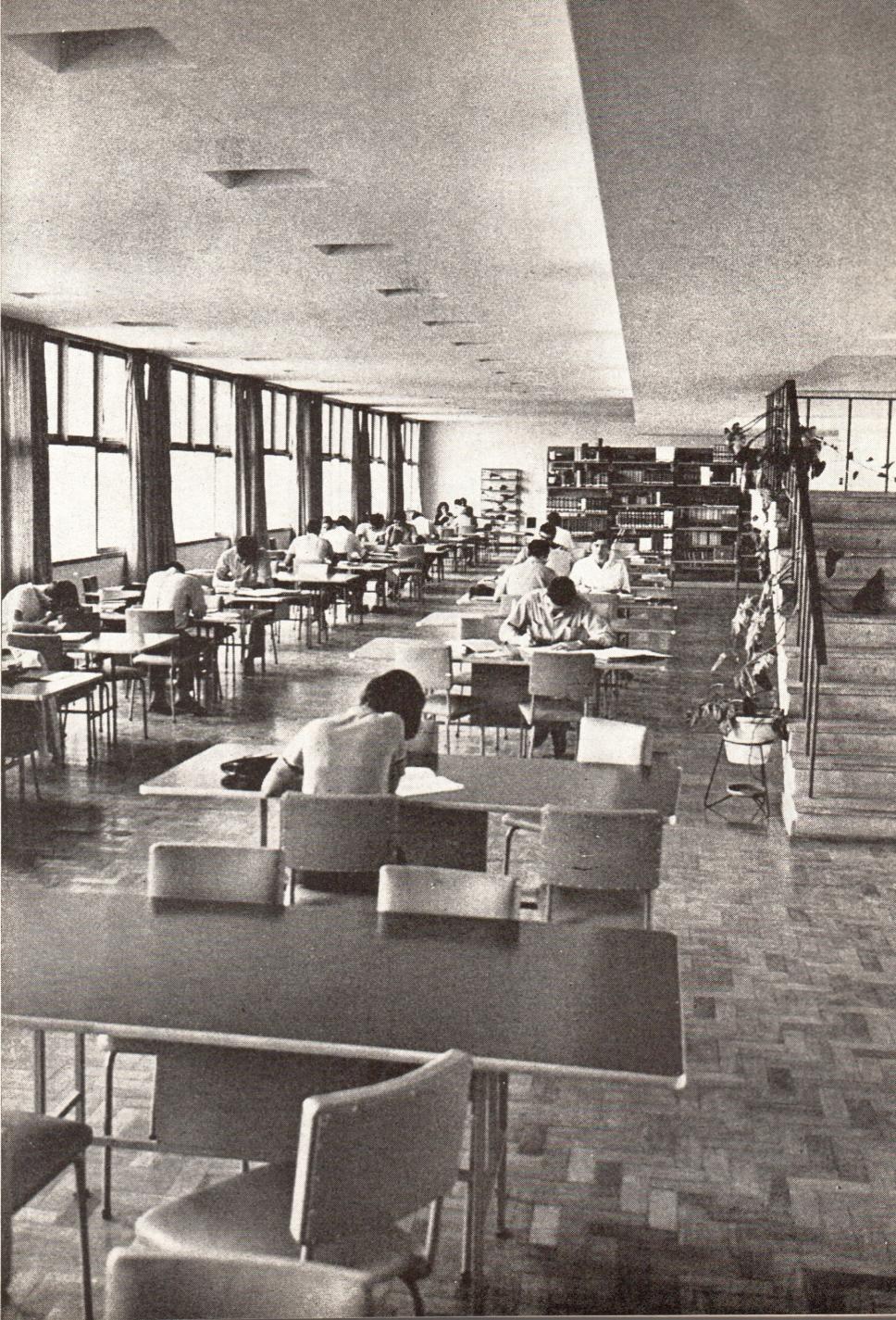 Salão de leitura da Biblioteca Central. Leitores nas mesas. Imagem publicada no Catálogo Geral da PUC-Rio de 1970.