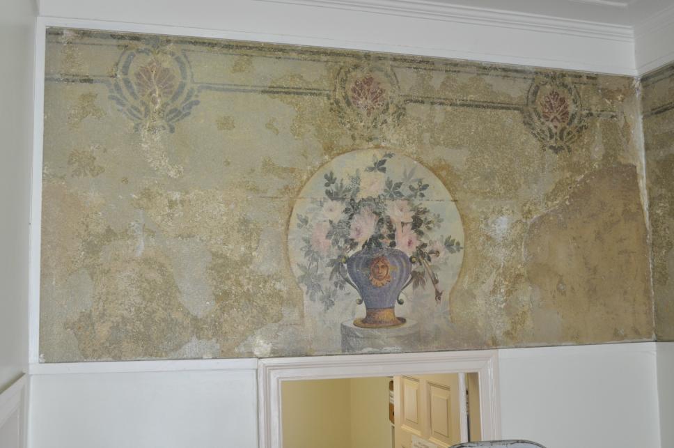 Pintura decorativa encontrada sob a tinta da parede do prédio do Departamento de Serviço Social.