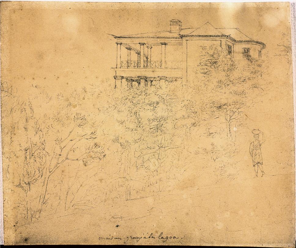 Maison Grandjean à la lagoa. Desenho a lápis de Jean-Baptiste Debret. Depositado no Museu da Chácara do Céu, Fundação Castro Maia. Registro precioso do Solar que inclui um esboço da mata e à direita a presença de uma mulher anônima.
