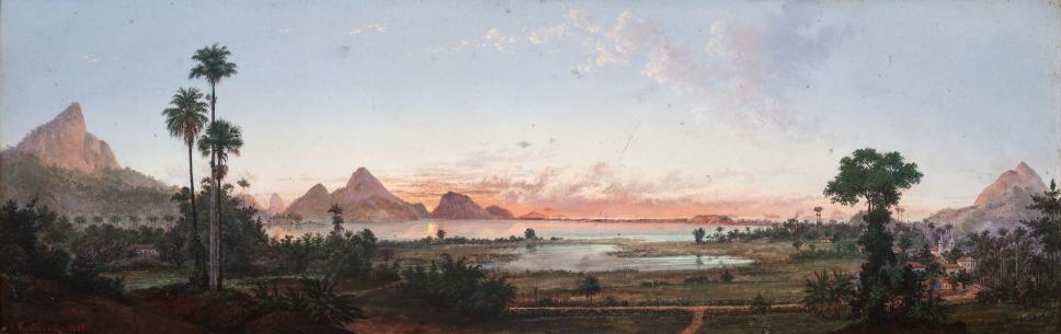 Nicolau Facchinetti, Lagoa Rodrigo de Freitas, Óleo sobre madeira. Acervo particular. Vista da lagoa Rodrigo de Freitas com o espelho d´água muito mais extenso. Ao fundo, o Corcovado (à esquerda) e o Morro Dois Irmãos (à direita). À direita, o Largo das Três Vendas e a Igreja de Nossa Senhora da Conceição da Gávea.