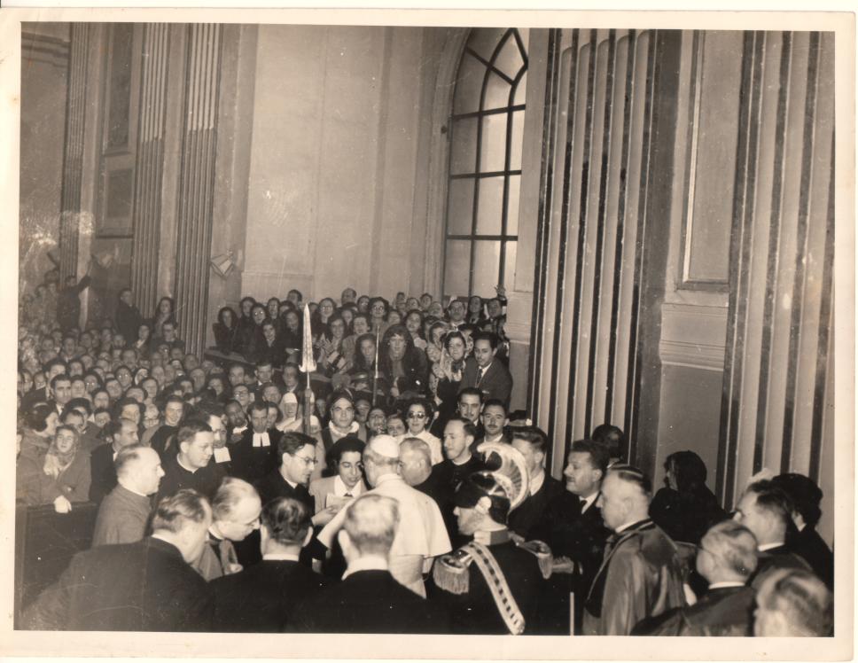 O Papa Pio XII benze a pedra fundamental da futura sede da Universidade Católica na Catedral de São Pedro, em Roma. A pedra foi levada pela segunda delegação das Faculdades Católicas às celebrações do Ano Santo.