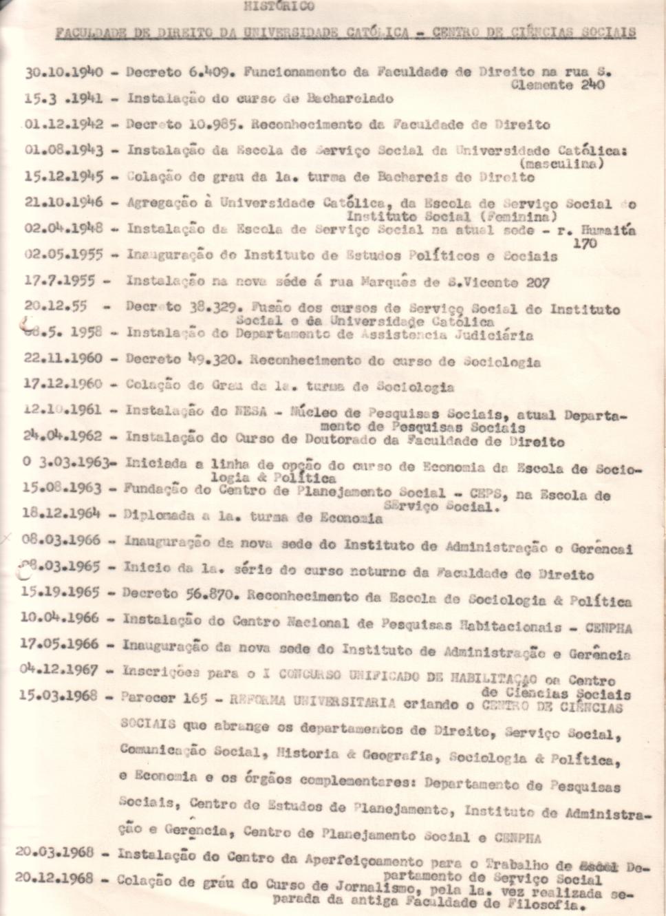 Histórico da Faculdade de Direito da Universidade Católica - Centro de Ciências Sociais. De 30/10/1940 a 20/12/1968. Efemérides pontuais.