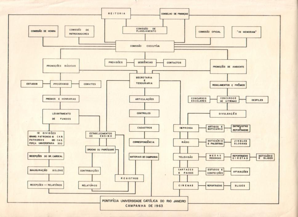 Organograma/diagrama da estrutura organizada para a Campanha Financeira de 1963. Há órgãos, funções e atividades misturados.