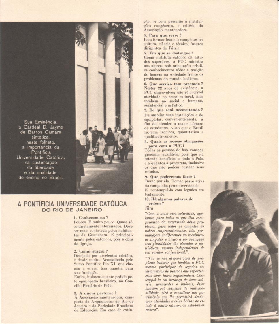 Parte interna de folheto com informações sobre a PUC-Rio. Foto de alunos circulando em frente ao Ed. Cardeal Leme e de aluno em sala de aula. Texto no estilo perguntas e respostas com o Grão-Chanceler Cardeal Dom Jaime de Barros Câmara, sobre "a importância da PUC, na sustentação da liberdade e da qualidade de ensino no Brasil".