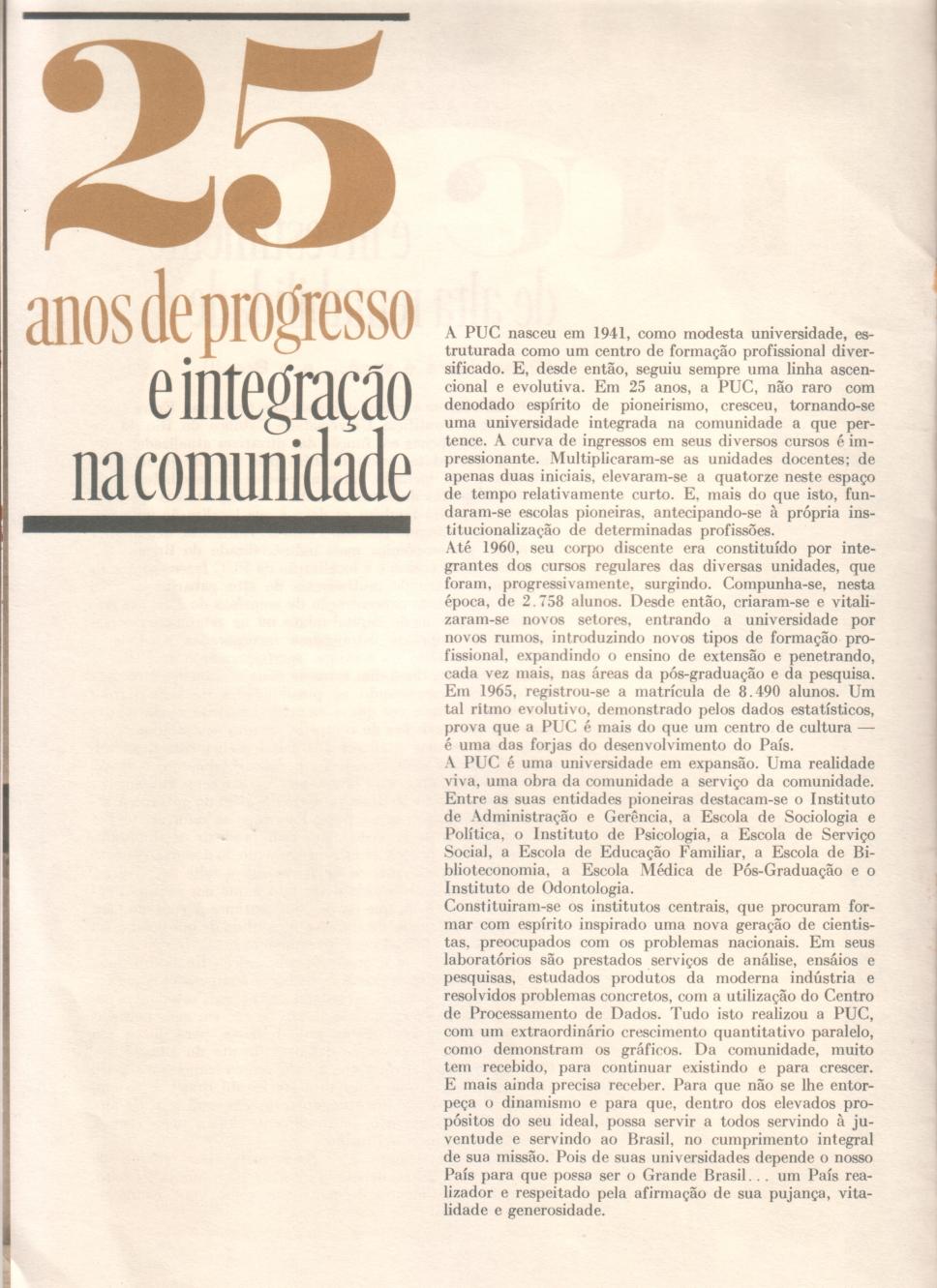 Página do folder de divulgação da Campanha Financeira "Seja mais uma coluna da PUC". "25 anos de progresso e integração na comunidade". Breve histórico da PUC-Rio. Quantidades de alunos e expansão dos cursos nos últimos anos.