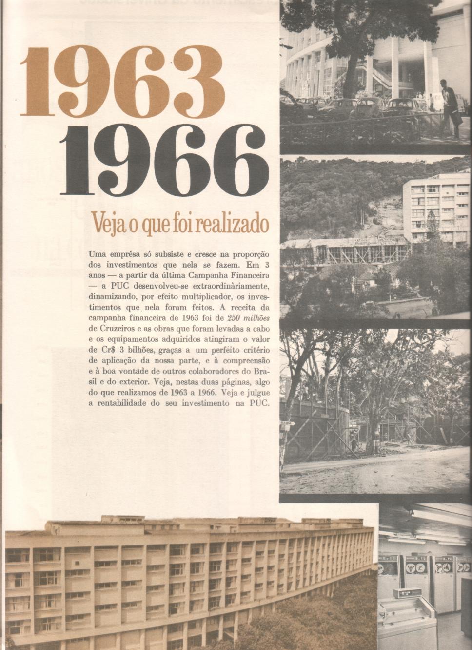Página do folder de divulgação da Campanha Financeira "Seja mais uma coluna da PUC". Balanço do que foi realizado entre 1963, quando houve uma grande campanha financeira, e 1966. Fotos de diversos pontos do campus Gávea, prontos ou em obras: Ed. Cardeal Leme, Instituto de Química, Instituto de Administração e Gerência (IAG), Centro de Processamento de Dados.