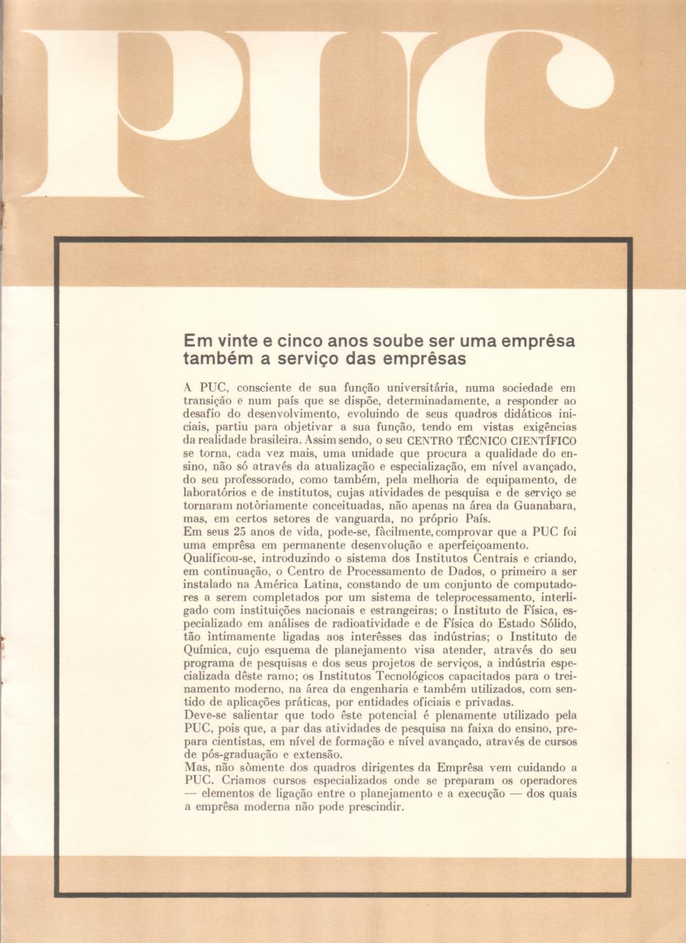 Página do folder de divulgação da Campanha Financeira "Seja mais uma coluna da PUC". "Em vinte e cinco anos soube ser uma empresa também a serviço das empresas". Texto sobre a "função universitária" da PUC-Rio "numa sociedade em transição". Fala, basicamente, das atividades do Centro Téncnico Científico (CTC).