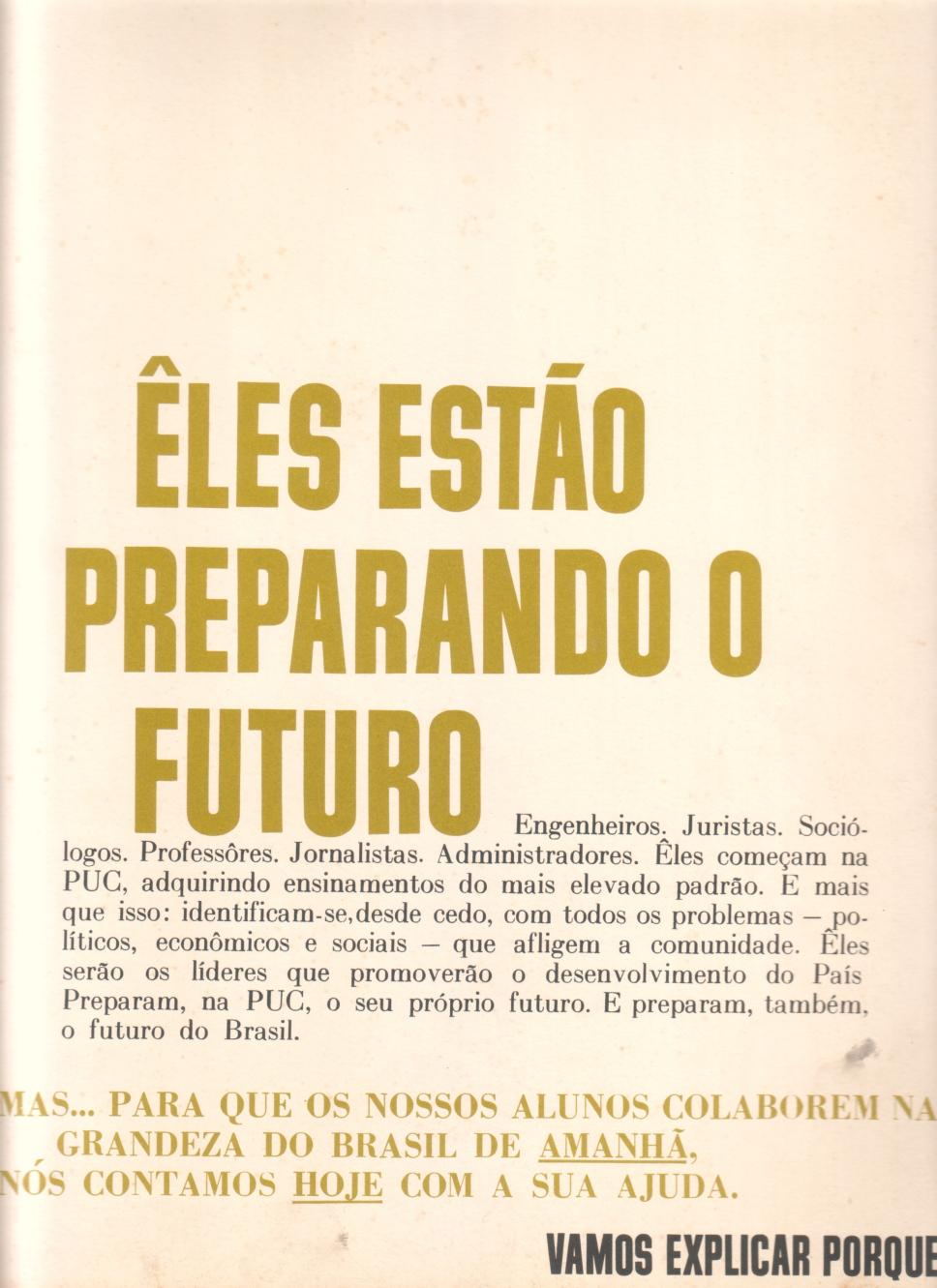 Página do folder de divulgação da Campanha Financeira "Seja uma coluna de apoio da PUC". "Eles estão preparando o futuro", "Mas, para que os nossos alunos colaborem na grandeza do Brasil de amanhã, nós contamoso hoje com a sua ajuda".