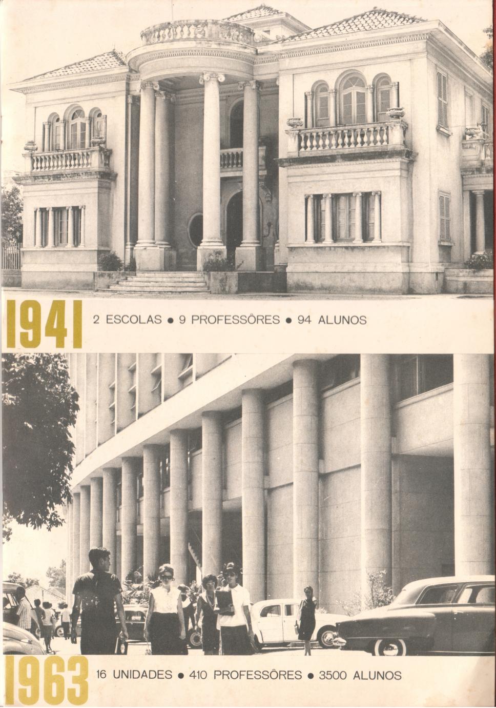 Página do folder de divulgação da Campanha Financeira "Seja uma coluna de apoio da PUC". Fotos de 1941 - o Palacete Joppert, "2 escolas, 9 professores, 94 alunos" - e de 1963 - o Ed, Cardeal Leme, "16 unidades, 410 professores, 3500 alunos". A foto do Leme tem alunos circulando na via em frente ao prédio e automóveis estacionados.