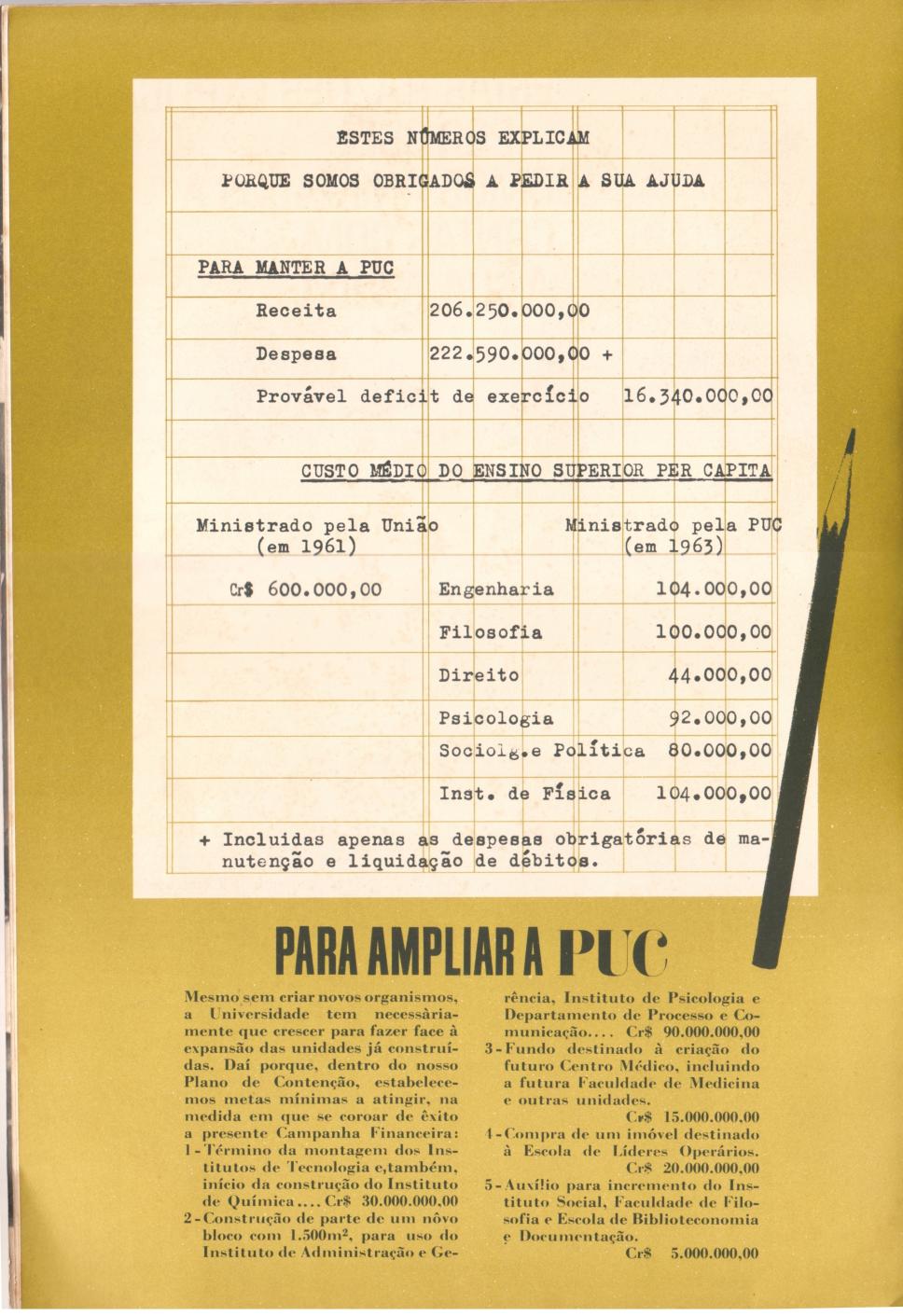 Página do folder de divulgação da Campanha Financeira "Seja uma coluna de apoio da PUC". "Estes números explicam porque somos obrigados a pedir a sua ajuda", dados sobre a manutenção da Universidade, o curto do ensino per capita e o que seria necessário "para ampliar a PUC". Cita a Escola de Líderes Operários (ELO) e o "futuro Centro Médico".