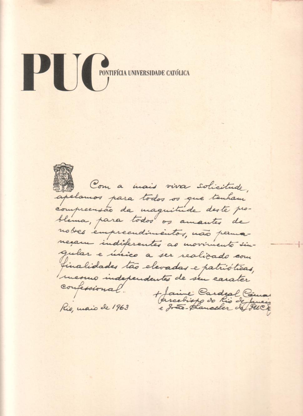 Fac-símile de carta do Grão-Chanceler da PUC-Rio, Cardeal Dom Jaime de Barros Câmara, conclamando à participação na Campanha Financeira da Universidade.