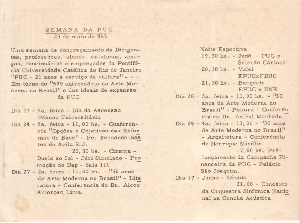 Folheto de divulgação da Semana da PUC, na qual houve o lançamento da Campanha Financeira e eventos artísticos. Programação de 23 de maio a 01 de junho. O tema eram os 50 anos da "Arte Moderna no Brasil" e "PUC - 21 anos a serviço da cultura". Conferências com o Pe. Ávila S.J., Alceu Amoroso Lima, Aníbal Machado e Henrique Mindlin. "Noite esportiva" com judô, voley e basquete. Concerto da Orquestra Sinfônica Nacional da Concha Acústica.