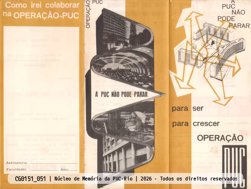 Folder de divulgação da Campanha Financeira da PUC-Rio, chamada neste ano de Operação-PUC. Imagens de prédios existentes e do projeto mais recente para o Campus Gávea.