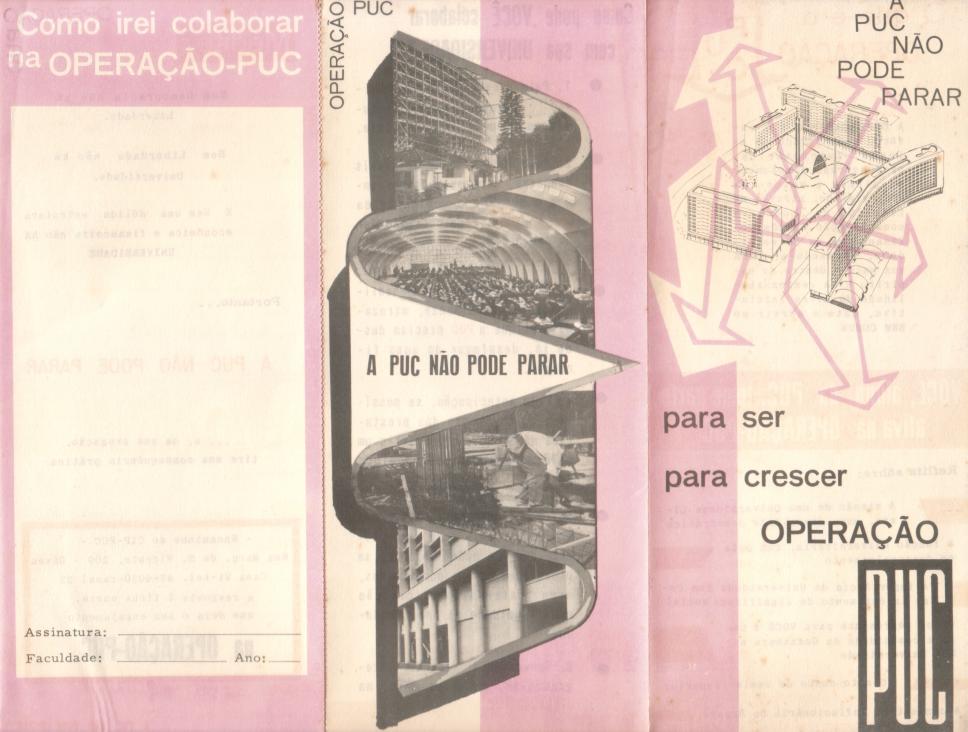 Folder de divulgação da Campanha Financeira da PUC-Rio, chamada neste ano de Operação-PUC. Imagens de prédios existentes e do projeto mais recente para o Campus Gávea. Lema: "A PUC não pode parar".