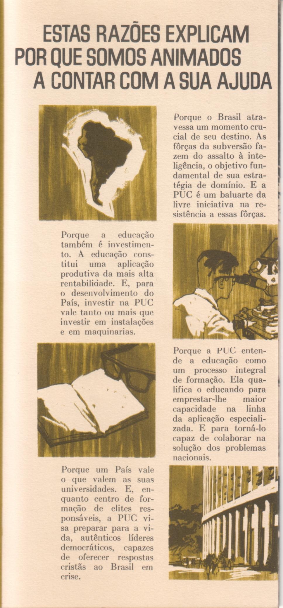 Página do folheto da campanha "Seja uma coluna de apoio da PUC". "Razões [...] porque somos animados a contar com a sua ajuda", com textos e ilustrações. "O Brasil passa por um momento crucial de seu destino. As forças de subversão fazem do assalto à inteligência o objetivo fundamental de sua estratégia de domínio. E a PUC é um baluarte da livre iniciativa na resistência a essas forças."