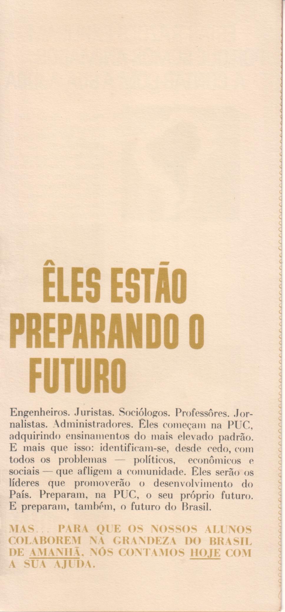 Página do folheto da campanha "Seja uma coluna de apoio da PUC". "Eles estão preparando o futuro", "Mas, para que os nossos alunos colaborem na grandeza do Brasil de amanhã, nós contamoso hoje com a sua ajuda".