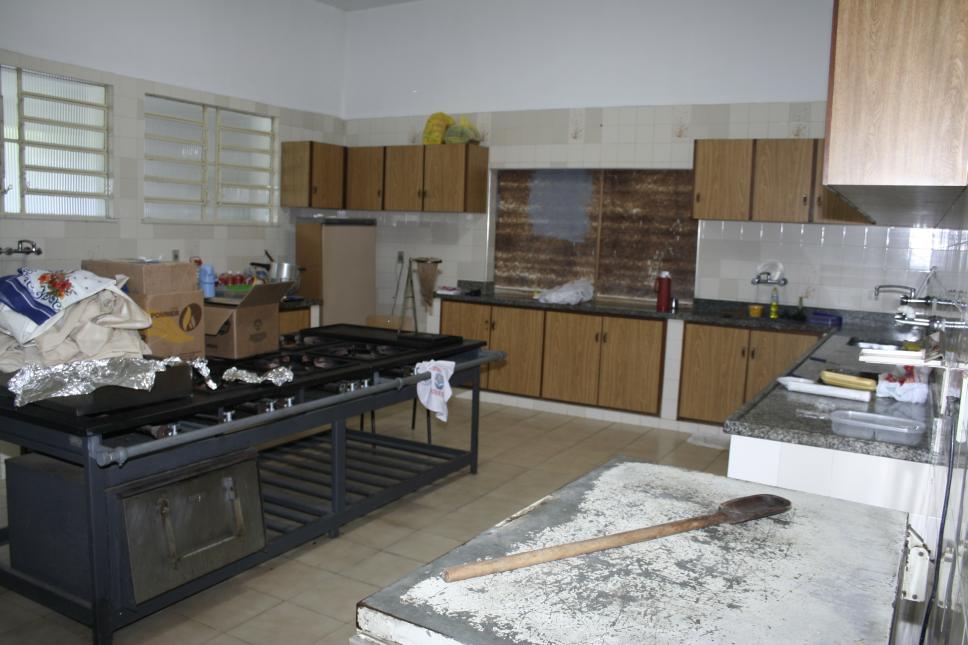 Estrutura existente no Pólo Avançado de Caxias, em preparação para o início dos cursos de extensão que ali seriam oferecidos. Cozinha, com balcões, pias, armários e fogão industrial.