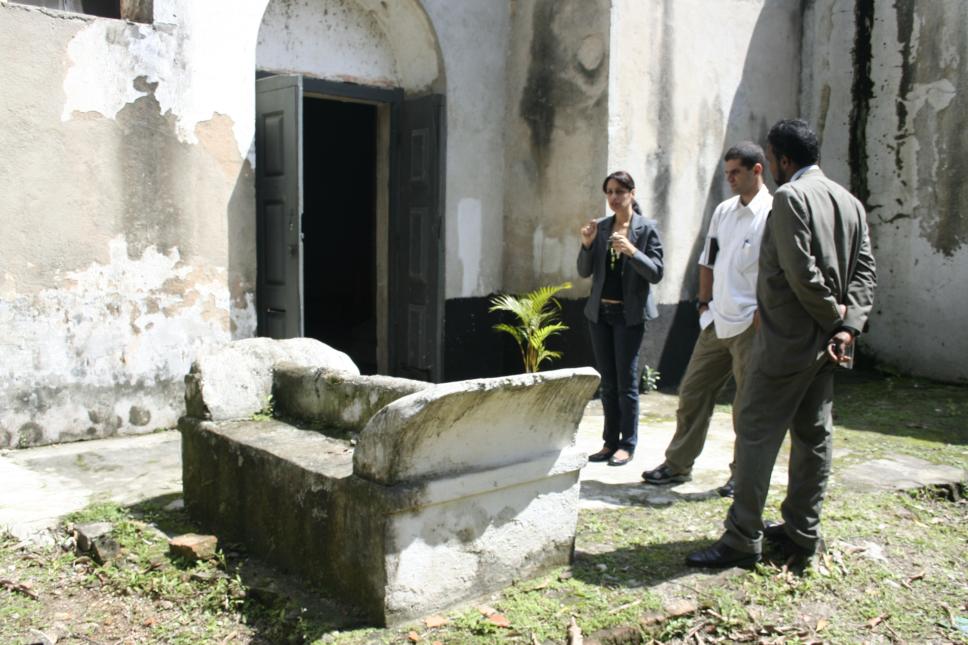 Estrutura existente no Pólo Avançado de Caxias, em preparação para o início dos cursos de extensão que ali seriam oferecidos. Grupo observa banco antigo no pátio da igreja.
