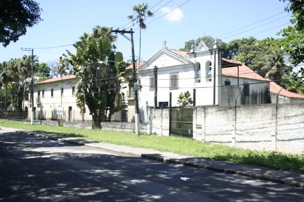 Estrutura existente no Pólo Avançado de Caxias, em preparação para o início dos cursos de extensão que ali seriam oferecidos. Vista externa do Instituto, a partir da rua, com a igreja e o prédio antigo.