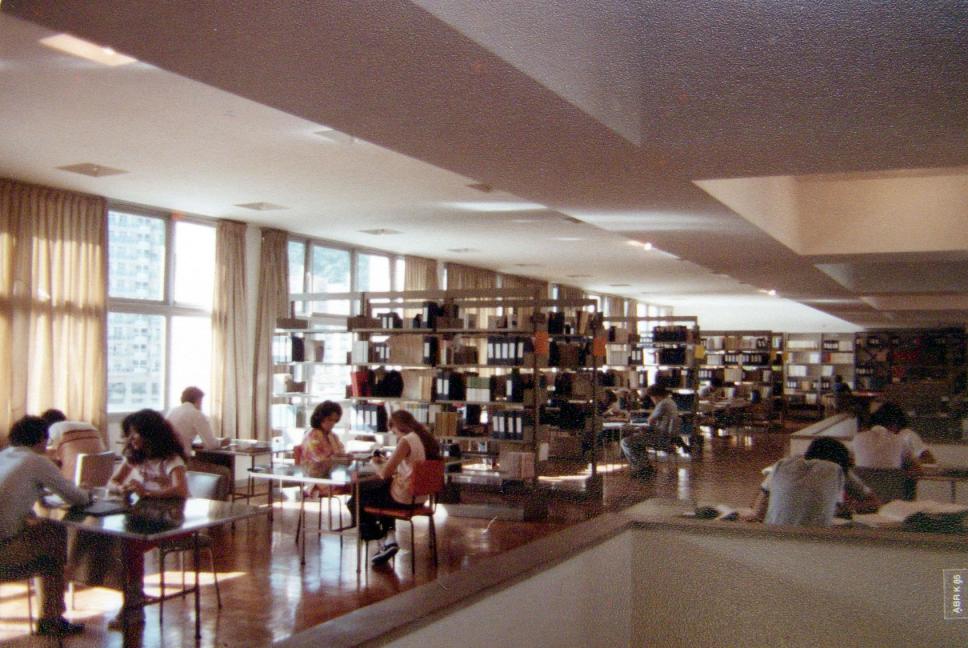 Salão de consulta do segundo andar da Biblioteca Central, com pesquisadores nas mesas.