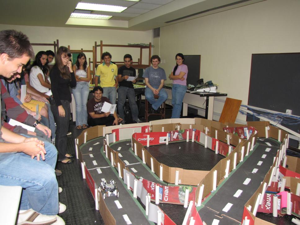 Alunos da profa. Geiza, com carros robóticos em uma pista feita com papelão.