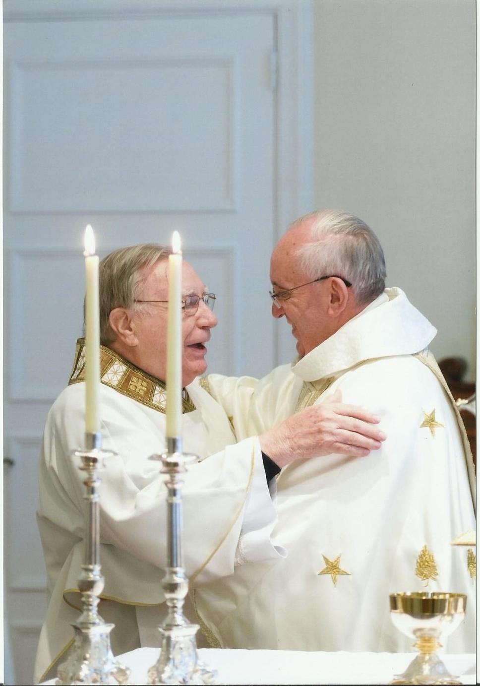 O Papa Francisco cumprimenta o pe. Ivern S.J. durante missa realizada na residência dos Jesuítas no Sumaré.