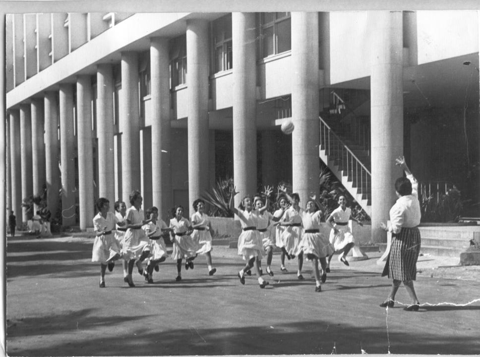 Alunas do Colégio teresiano, acompanhadas por professora, fazem atividade recreativa com bola. É provavel que a área de recreação do Teresiano ainda estivesse em obras, por isso o uso do campus da PUC-Rio que, naquela época, era muito tranquilo.