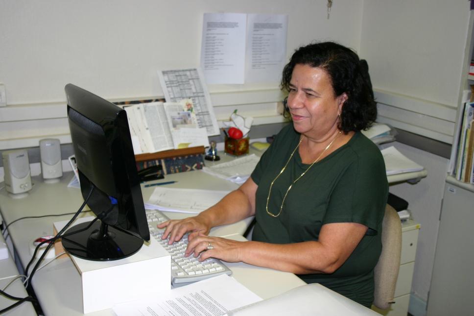 Funcionária Maria de Lourdes dos Santos Mendonça (DBD) em seu ambiente de trabalho.
