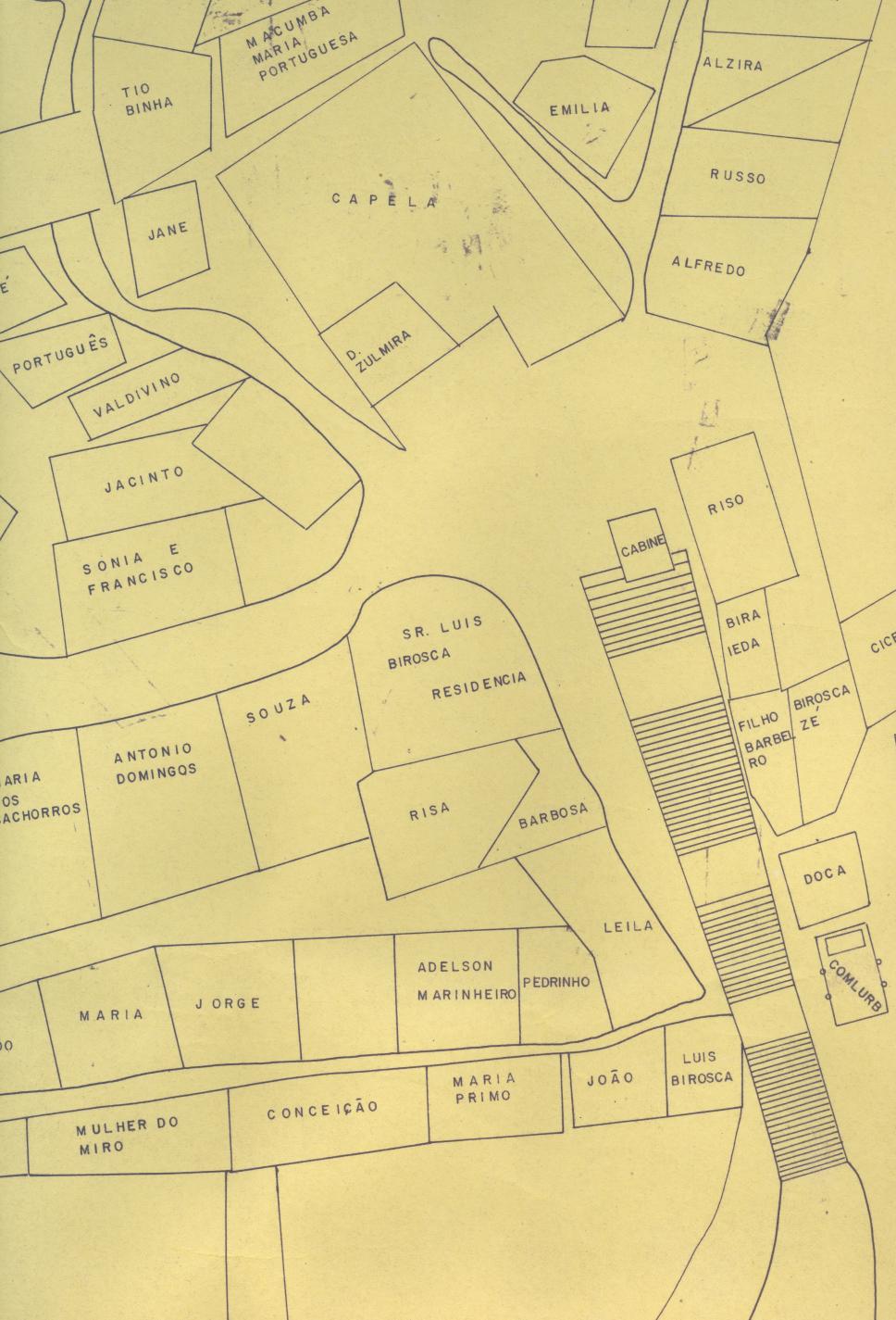 Mapa esquemático do Morro Santa Marta. Indicação das casas com nomes dos moradores ou do local, como a Capela. Alguns nomes: Tio Binha, Jane, Português, Macumba Maria Portuguesa, Birosca, Adelson Marinheiro, Mulher do Miro, Maria dos Cachorros, Comlurb.