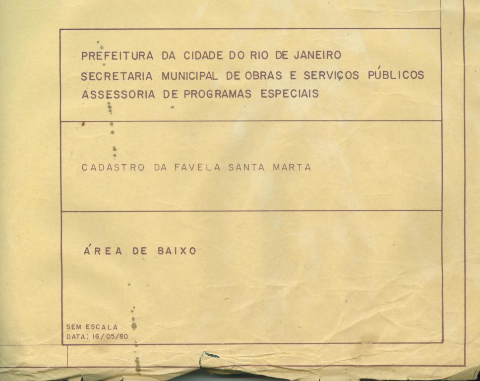 Mapa esquemático do Morro Santa Marta. Quadro com a autoria: "Prefeitura da Cidade do Rio de Janeiro, Secretaria de Obras e Serviços Públicos, Assessoria de Programas Especiais". "Cadastro da Favela Santa Marta". "Àrea de baixo".