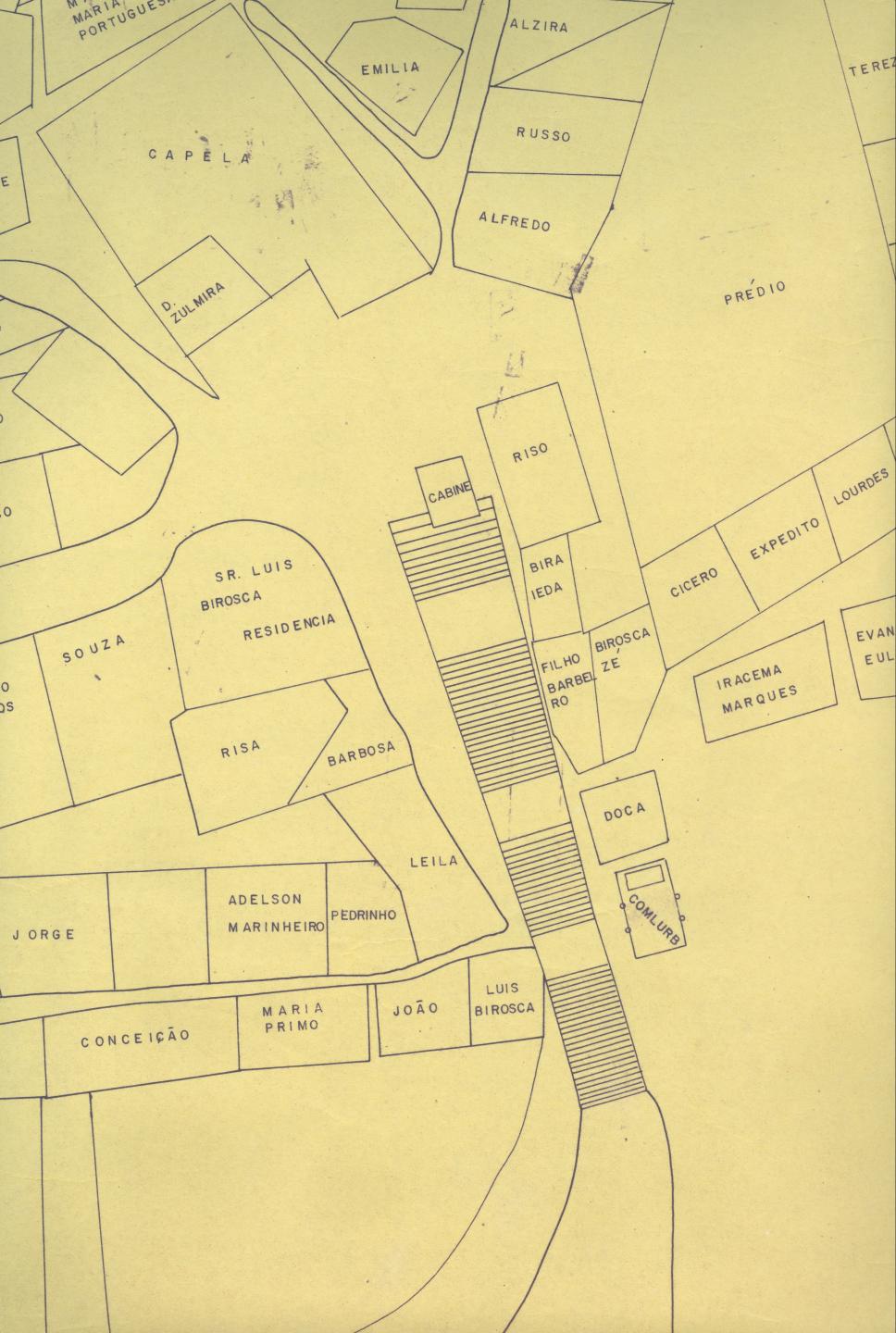 Mapa esquemático do Morro Santa Marta. Indicação das casas com nomes dos moradores ou do local, como a Capela e a Comlurb. Alguns nomes: D. Zulmira, Iracema Marques, Maria Primo, Filho Barbeiro.