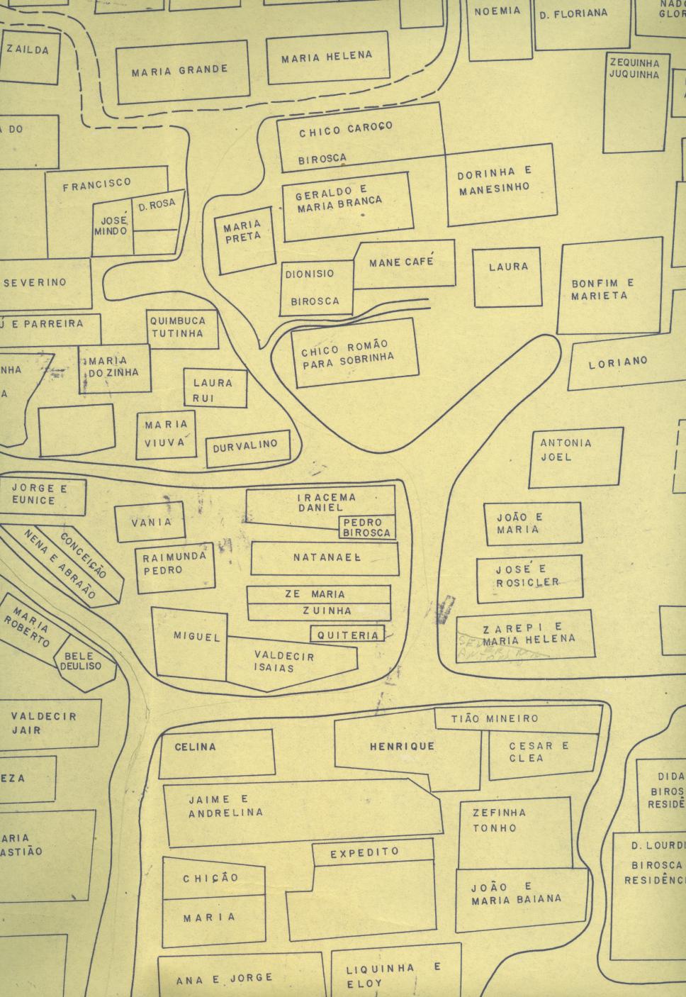 Mapa esquemático do Morro Santa Marta. Indicação das casas com nomes dos moradores. Alguns nomes: Maria Grande, Zequinha Juquinha, Chico Caroço, José Mindo, Dorinha e Manesinho, Mane Café, Chico Romão Para Sobrinha, Quimbuca Tutinha, Maria do Zinha, Zuinha, João e Maria Bahiana.
