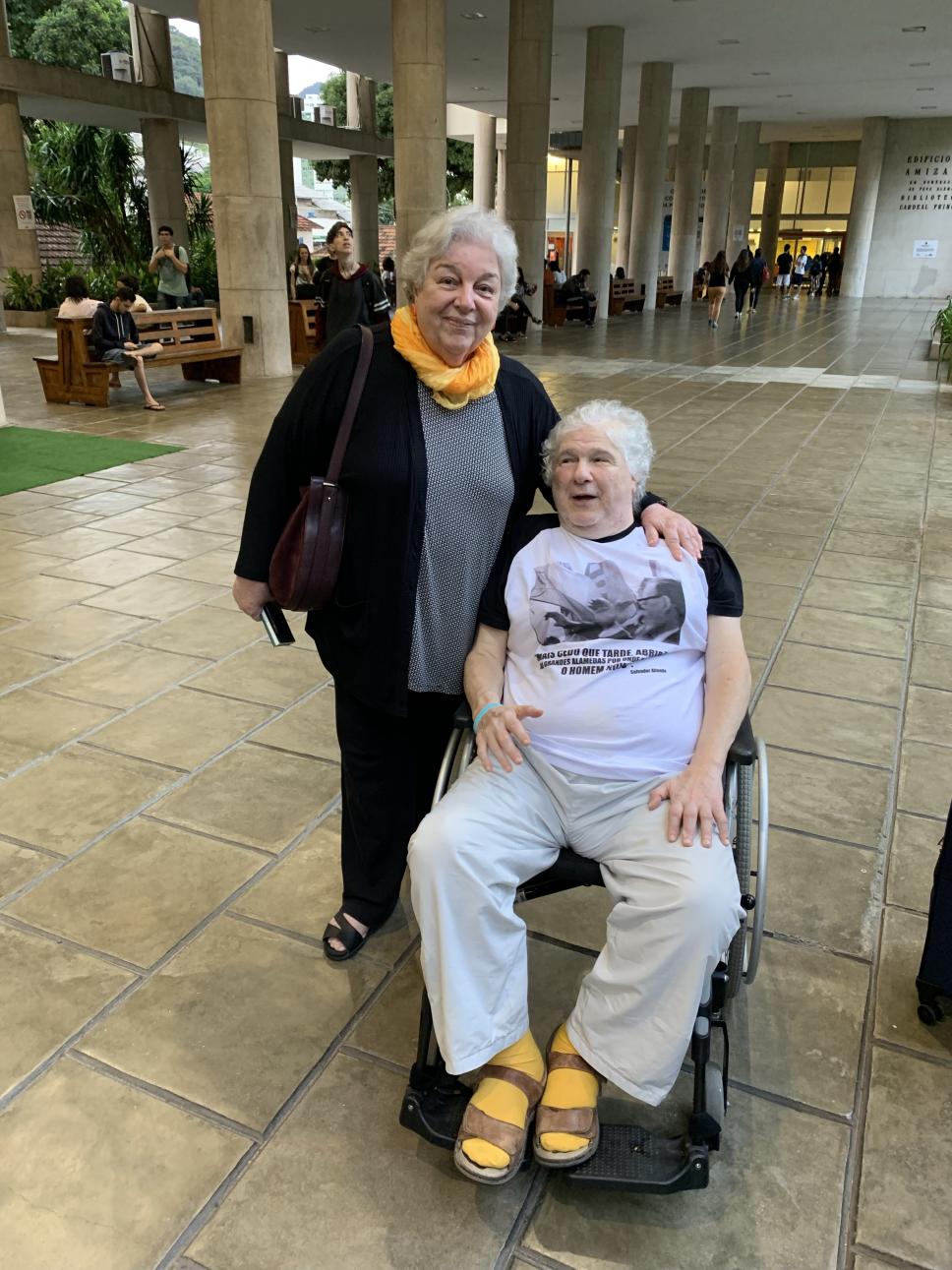 Encontro casual da profa. Margarida de Souza Neves (Núcleo) com o prof. Silvio Tendler (COM), no último dia de trabalho formal do prof. Tendler na Universidade.