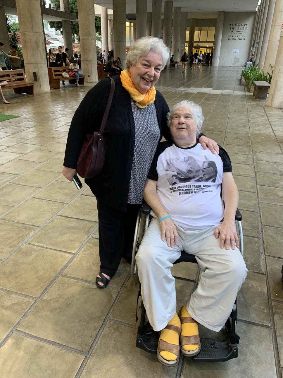 Encontro casual da profa. Margarida de Souza Neves (Núcleo) com o prof. Silvio Tendler (COM), no último dia de trabalho formal do prof. Tendler na Universidade.